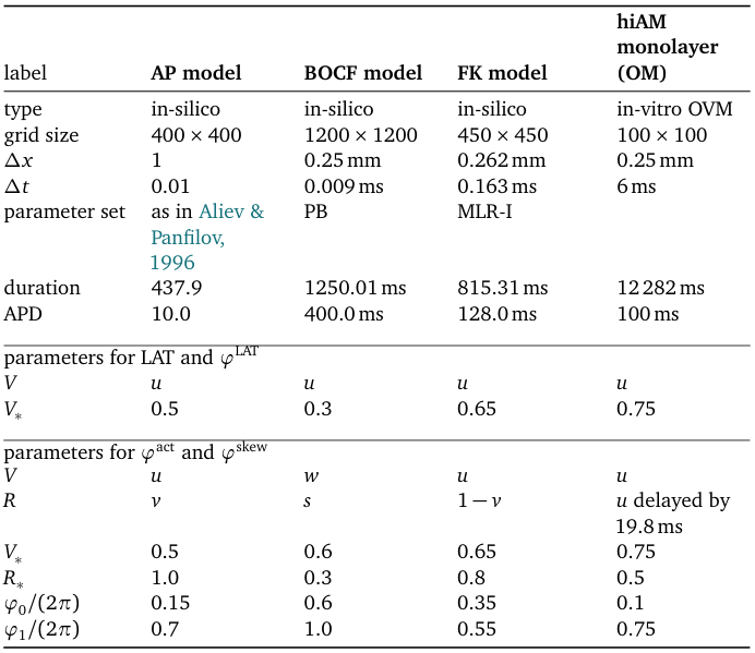 All simulations were executed on a 2D isotropic square domain of myocardial tissue using Neumann boundary conditions and a 5-point stencil for the Laplacian. Integrating in time is done using forward Euler stepping, with values per model given in Table 1. There, we also present the typical APD values and other parameters that we use for the calculation of the phases.